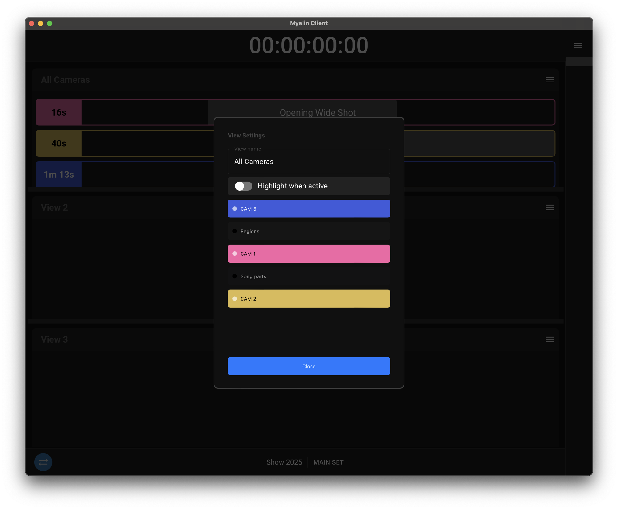To keep everyone involved in your show up to date, Myelin Director comes with a built-in Myelin Client. This client can be opened in any browser, or you can download the native applications for macOS, Windows, and iOS.