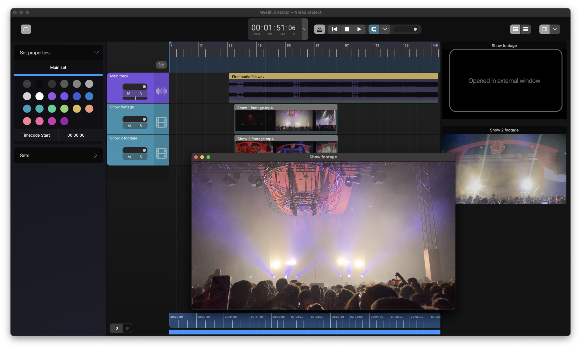Visual media tracks can also have their own separate window, to be able to enlarge the content, or show it in full on a separate display for example. In order to do so, you click [Window] -> [Show trackname] in the menu bar. This launches a dedicated window for the visual media track and disables the sidebar view.